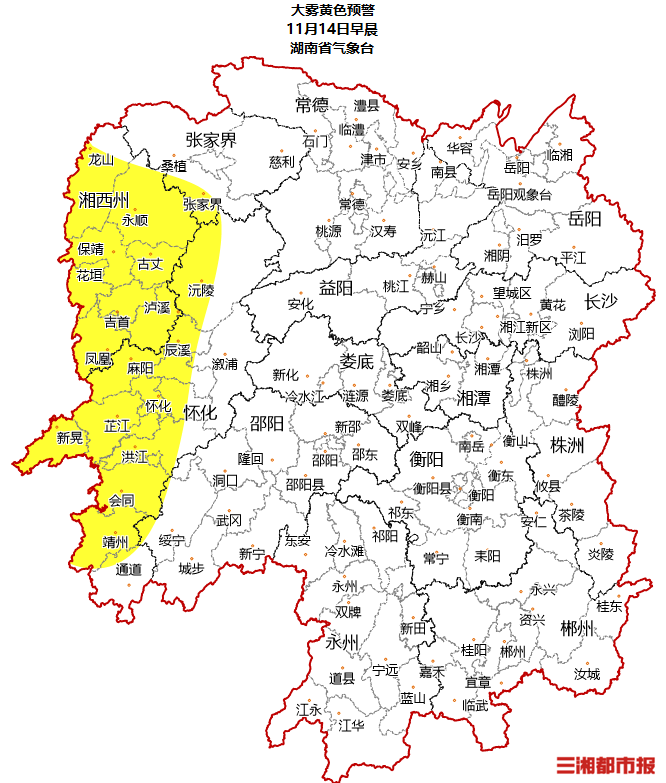 華聲在線11月13日訊(全媒體記者 李致遠)湖南省氣象臺11月13日16時發布大霧黃色預警:預計14日早晨,張家界西南部、懷化、湘西土家族苗族自治州將出現能見度小于等于500米的霧或雨霧,局部有能見度小于等于200米的濃霧,將對交通產生較大影響。