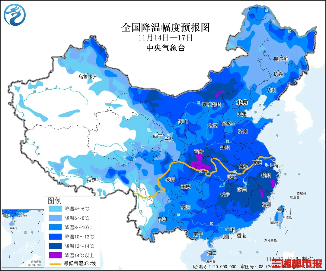 受寒潮天氣影響,14-17日,我國北方和中東部地區氣溫將普遍下降6~10℃,內蒙古中西部、陜西南部、重慶北部及江南中東部等地降溫12~14℃;18日早晨,最低溫度0℃線將南壓至蘇皖南部、湖北北部一帶。上述大部地區有4~6級風、陣風7~8級,新疆北部山口地區、內蒙古東南部局地陣風9~11級。