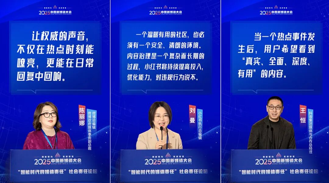 “平臺·大生態(tài)澎湃大流量”圍繞平臺企業(yè)的生態(tài)責(zé)任展開。微博政府媒體事務(wù)副總裁、微博總編輯陳麗娜,小紅書執(zhí)行總編輯劉曼,抖音集團媒體與合作總經(jīng)理王恒等平臺代表,分別結(jié)合各自平臺特性,深度闡述了在社交敘事煥新、算法向善治理、助力優(yōu)質(zhì)內(nèi)容傳播等方面的探索。