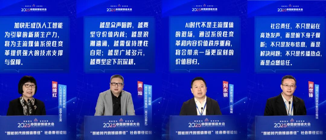 “內(nèi)容·大變革推動高質(zhì)量”篇章聚焦智能時代的內(nèi)容價值構(gòu)建,人民網(wǎng)監(jiān)事會主席、人民網(wǎng)研究院院長唐維紅,南方報業(yè)傳媒集團(南方日報社)副社長、總編輯黃燦,澎湃新聞總裁、總編輯劉永鋼,湖南紅網(wǎng)新媒體集團總編輯肖世鋒分別從內(nèi)容建設(shè)、融合轉(zhuǎn)型、AI時代媒體責(zé)任、媒體的社會責(zé)任實踐等方面,分享了前沿思考與實戰(zhàn)案例。