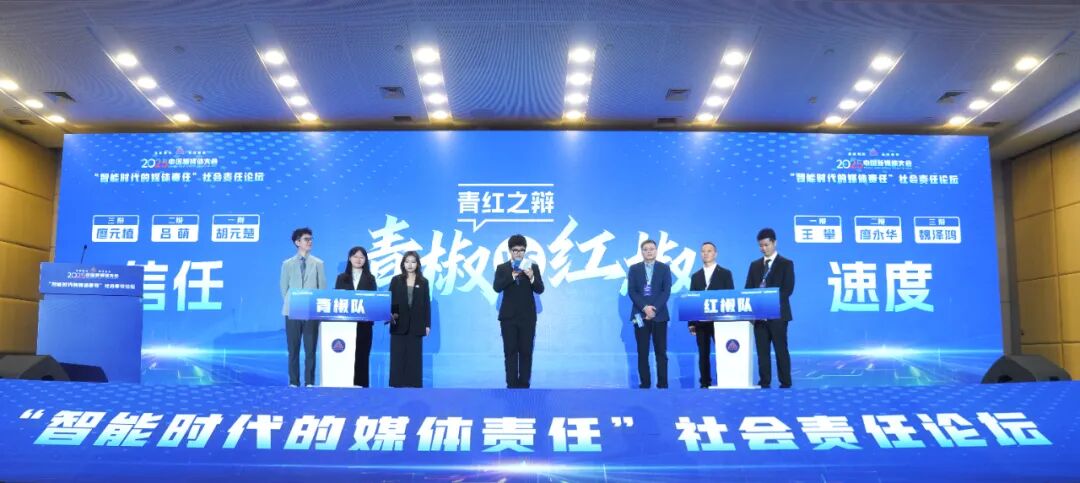 在“青紅之辯”環(huán)節(jié),由北京大學(xué)新聞與傳播學(xué)院的學(xué)生代表組成的“青椒隊”與紅網(wǎng)“紅辣椒評論”資深評論作者組成的“紅椒隊”圍繞“傳播的影響力,更依賴速度還是信任?”展開激烈辯論。通過觀點交鋒和思維碰撞,展現(xiàn)出青年一代對媒體使命的深刻理解。