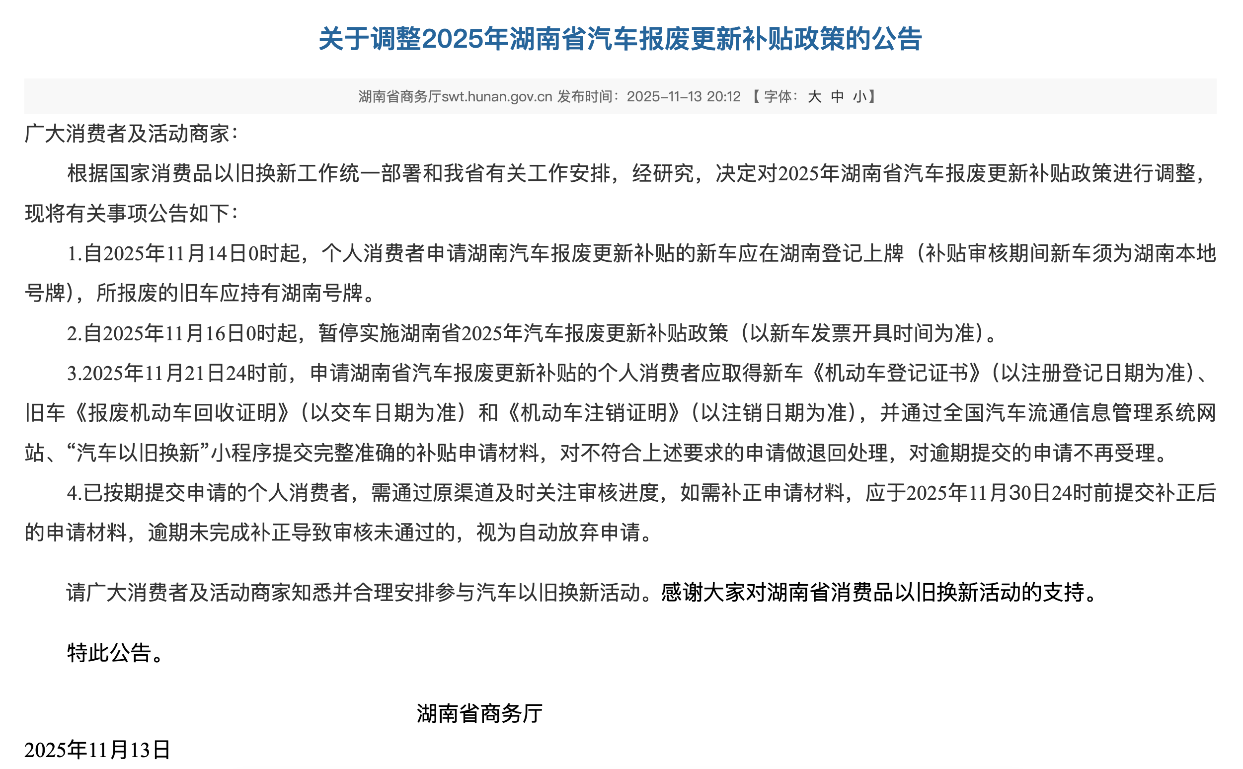 2.自2025年11月16日0時起,暫停實施湖南省2025年汽車報廢更新補貼政策(以新車發票開具時間為準)。