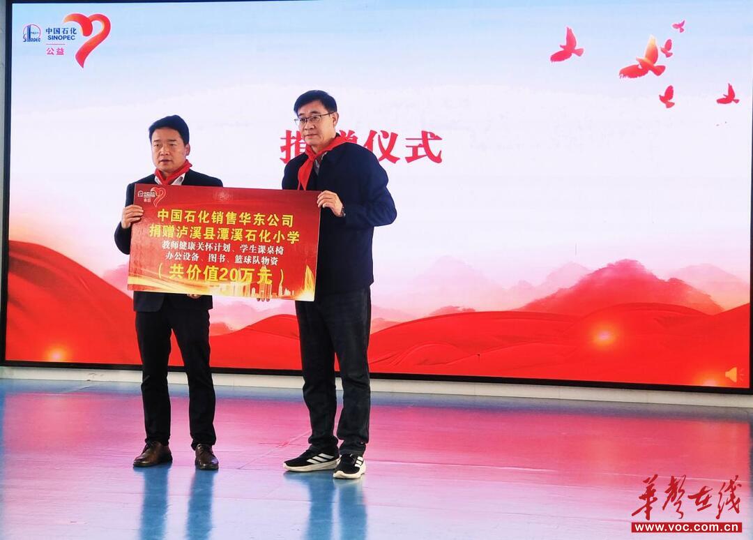 物資捐贈環節將活動推向高潮,中石化銷售華東公司領導向學校贈送20萬元物資牌,為改善辦學條件提供堅實支撐。?