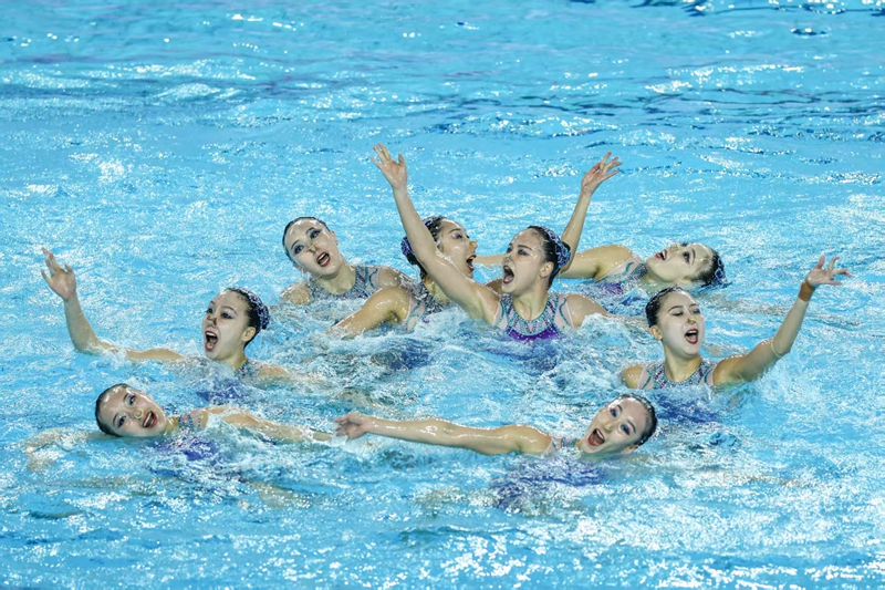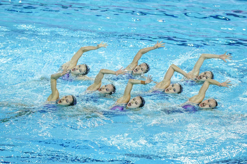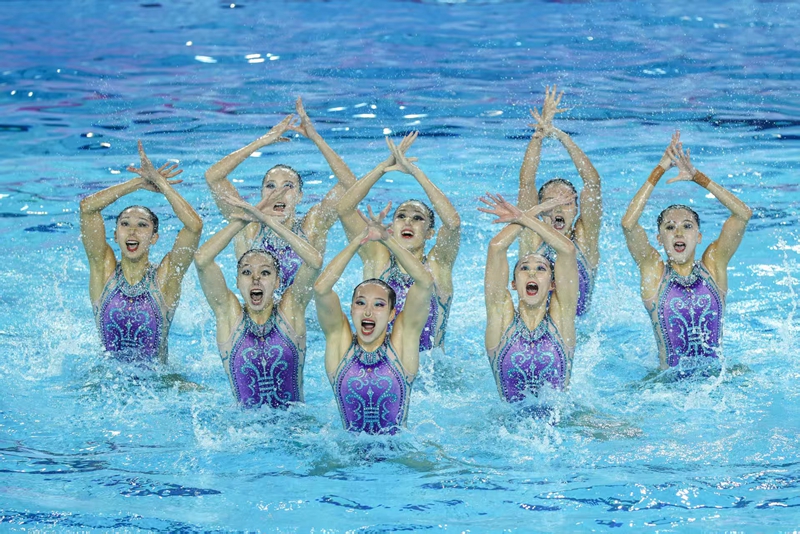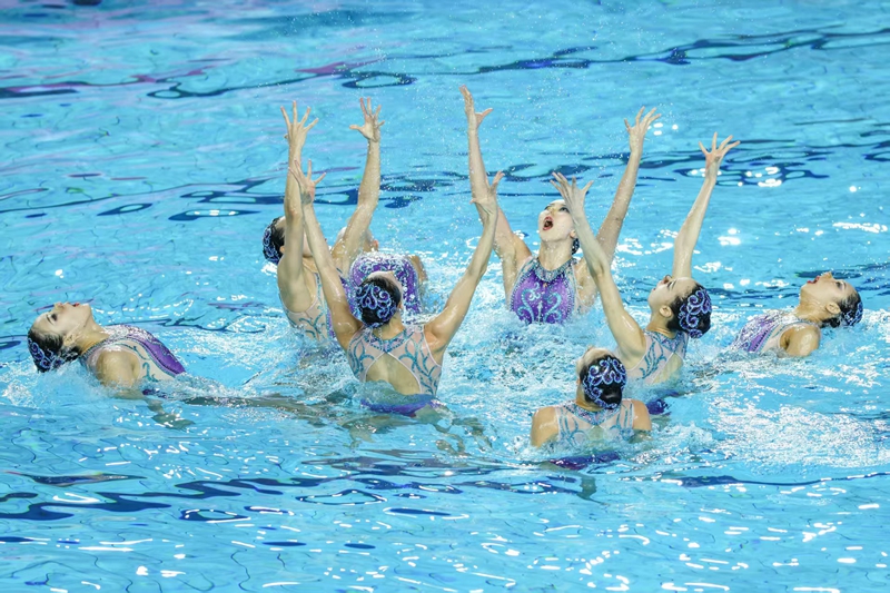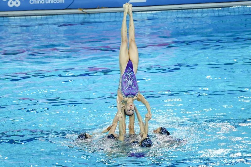 11月14日晚,第十五屆全運會花樣游泳集體項目在江門體育中心游泳館結束爭奪,長沙妹子張雅怡、郴州妹子樊家懿(均為體教聯合培養)與北京體育大學隊隊友合作,在技術自選、自由自選、技巧自選三項比賽中一共拿到867.9665分,奪得冠軍。這樣,張雅怡和樊家懿為湖南體育代表團再添兩枚金牌。圖為北京體育大學隊在13日晚進行自由自選賽。華聲在線全媒體記者 傅聰 攝