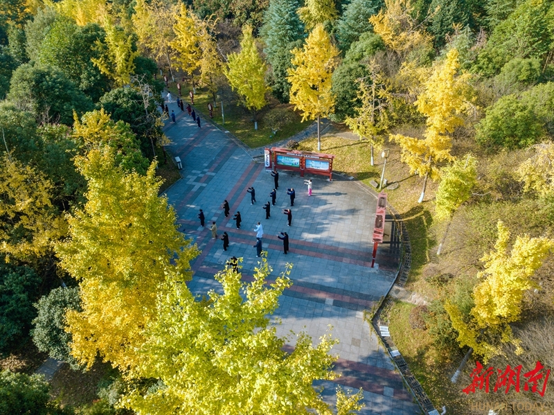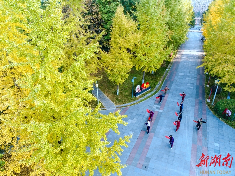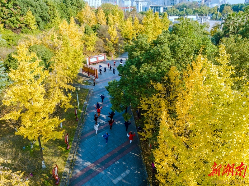 11月14日,吉首市世紀廣場,市民在銀杏樹下健身鍛煉。初冬時節,該市各大廣場、公園及街道兩旁的銀杏樹披上金裝,為城市增添了一道浪漫與詩意的色彩,吸引人們紛紛走出家門前來觀賞拍照、休閑游玩、鍛煉身心,盡享冬日愜意時光。 彭璟 攝(湖南圖片庫)