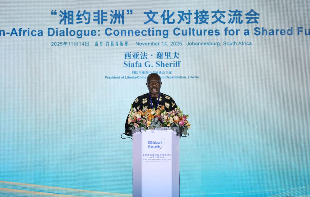 圖為利比里亞利中友好協會主席西亞法·謝里夫在活動上致辭(新華社記者 韓旭 攝)利比里亞利中友好協會主席西亞法·謝里夫在致辭中強調了全球文明共生中的中非交融,他表示:“中非文明交流不僅關乎文化,更關乎塑造一個更加和諧、包容的世界秩序。通過加深相互理解并促進文明間的共存,中國和非洲能夠在引領全球南方走向團結、尊重與共同進步方面發揮主導作用。”