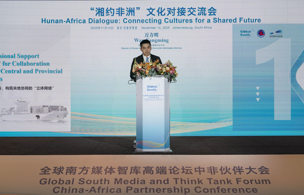 11月14日,“全球南方”媒體智庫高端論壇中非伙伴大會“湘約非洲”文化對接交流會在南非約翰內斯堡成功舉行。來自中非的文化領域官員、主流媒體智庫代表、文化企業負責人及智庫專家齊聚一堂,共同探討中非文化交流合作的新路徑、新機遇。