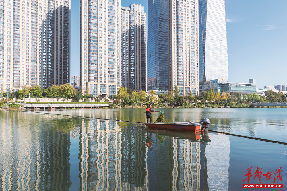 11月19日,湖南湘江新區(qū)梅溪湖,保潔人員在清理湖面水草及漂浮物。近年來(lái),該區(qū)建立河湖保潔常態(tài)化管理機(jī)制,確保轄區(qū)河湖水清、岸綠、景美,為市民提供美麗、生態(tài)、宜居的城市環(huán)境。