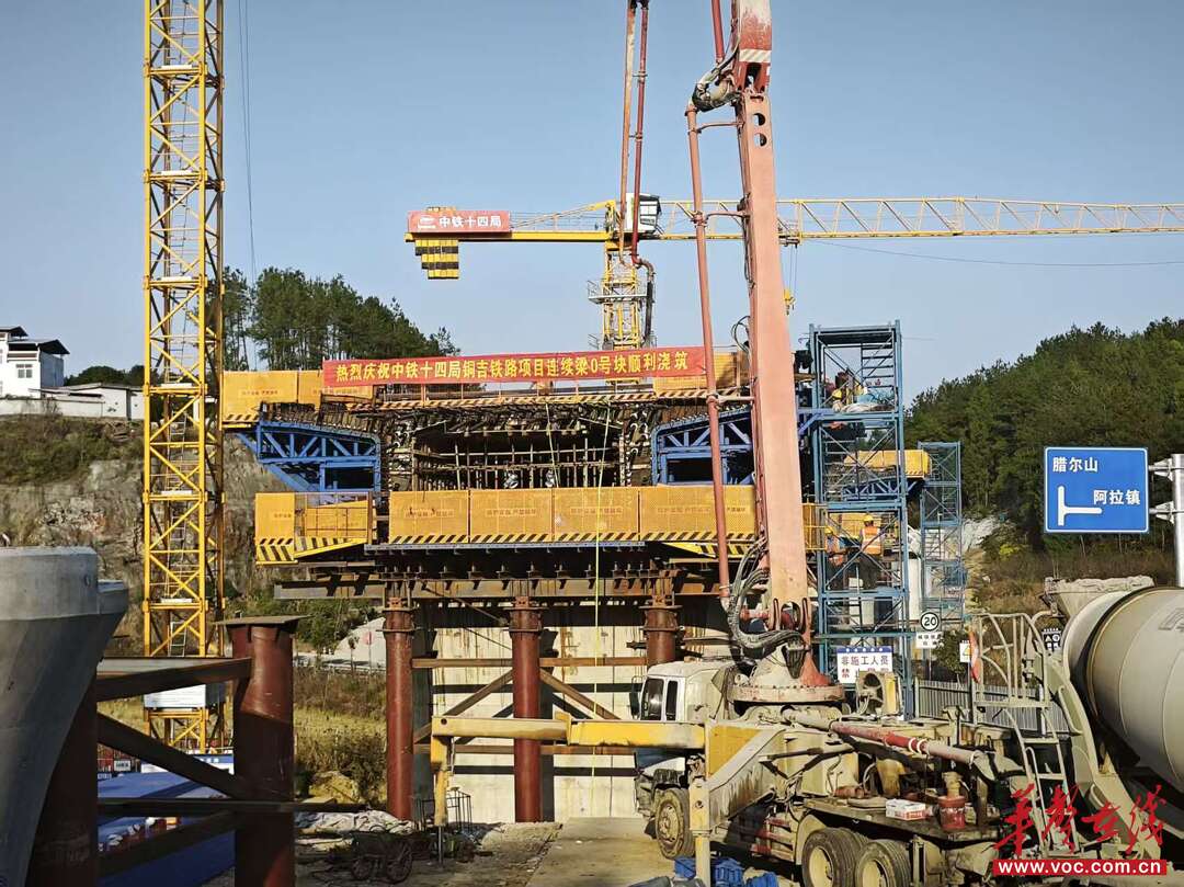 (11月15日,銅吉鐵路湖南段跨X052縣道大橋完成全線首個橋梁0號塊澆筑。 國鐵廣州局供圖)