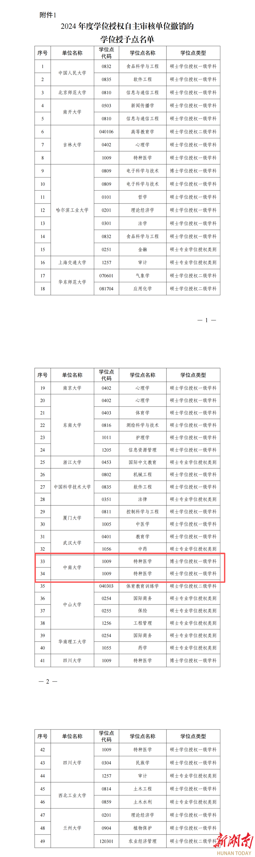 此次2024年自主審核撤銷(xiāo)名單顯示,中南大學(xué)主動(dòng)撤銷(xiāo)“特種醫(yī)學(xué)”(博士、碩士學(xué)位授權(quán)一級(jí)學(xué)科)。