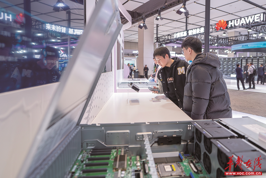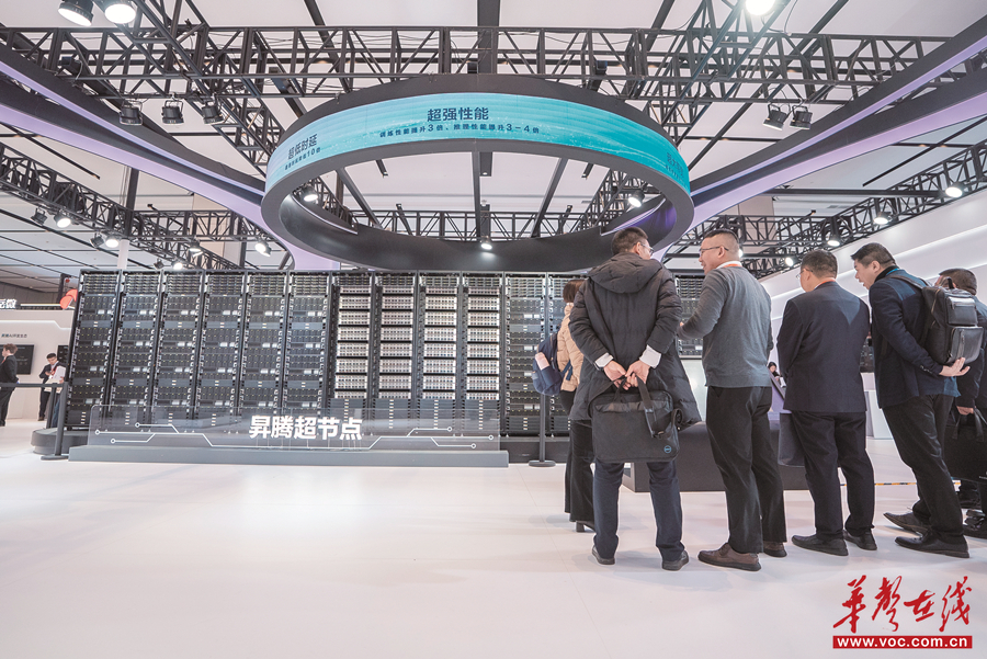 11月21日,長沙北辰國際會議中心,觀眾在2025世界計算大會創新成果展示區參觀昇騰384超節點系統。