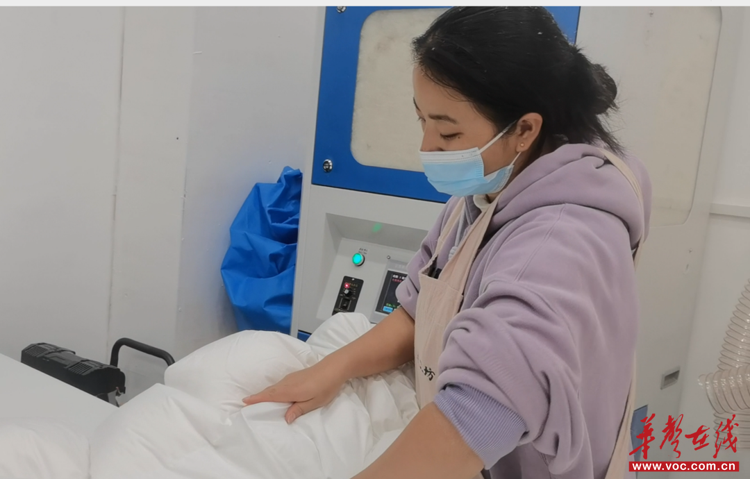 雙方談好價(jià)格后,記者看到店主陳女士先對舊羽絨服進(jìn)行評估登記,隨后剪掉外殼提取羽絨;通過振動(dòng)篩選過濾毛梗、飛絲等雜質(zhì),確保羽絨純度;再由充絨機(jī)將處理后的羽絨均勻注入被殼;最后將加工好的羽絨被放入消毒柜消殺30分鐘,一床“專屬暖被”便完成制作。