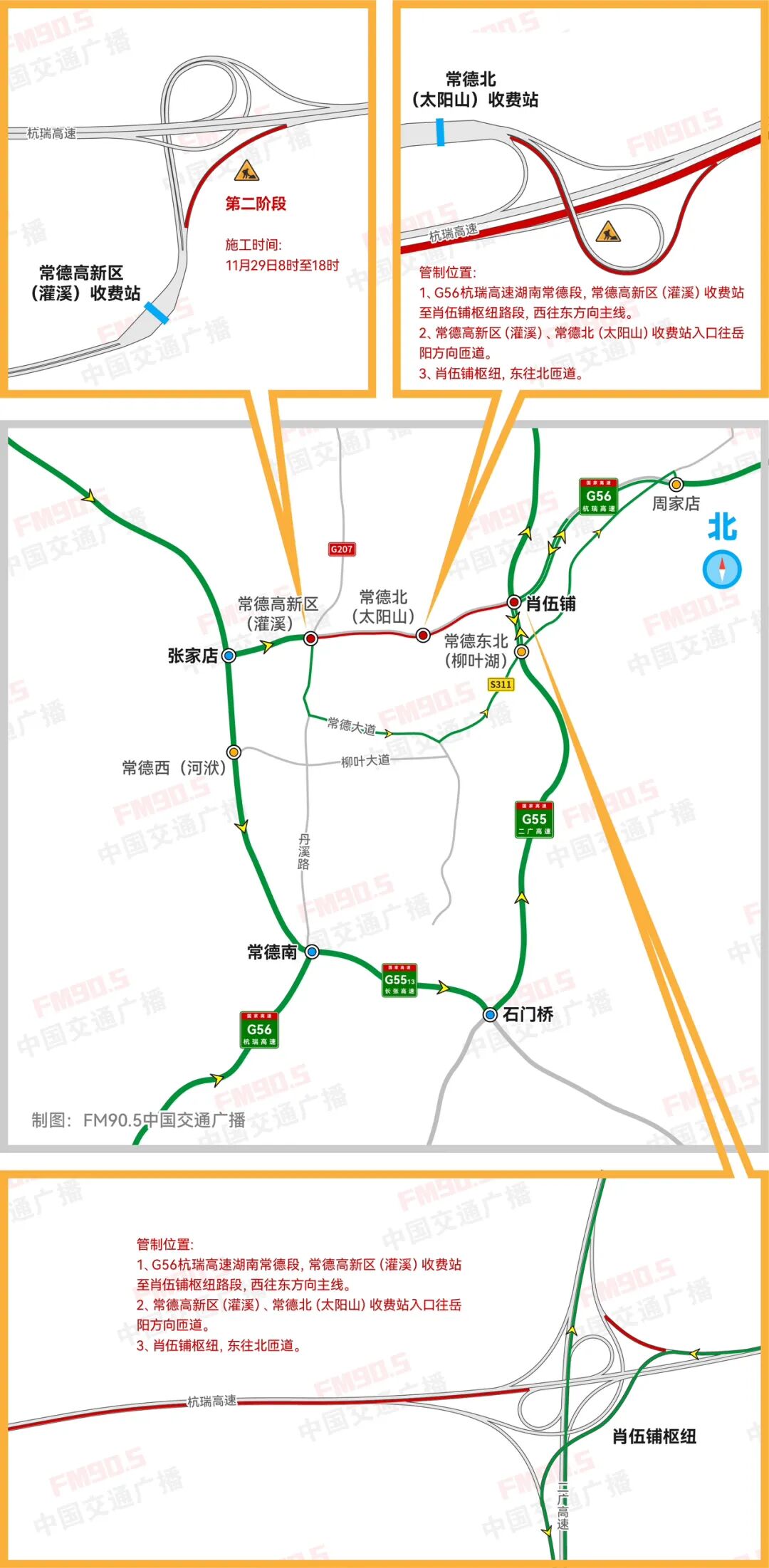 3.吉首方向往岳陽方向駕駛員,提前從常德南樞紐轉(zhuǎn)G5513長張高速往長沙方向,至石門橋樞紐轉(zhuǎn)G55二廣高速往澧縣、荊州方向,至肖伍鋪樞紐再轉(zhuǎn)G56杭瑞高速往岳陽、杭州方向通行。
