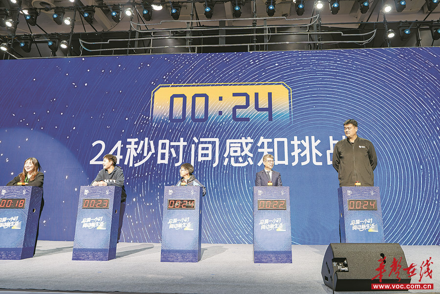 11月23日,姚明(右一)與觀眾代表共同進行“24秒時間感知”挑戰。當天,“息屏一小時 閱動新生活”公益活動在長沙啟動。活動倡導公眾減少電子依賴,走進書本、擁抱運動與自然。全省100家新華書店聯動開展閱讀推廣,促進青少年文化學習與體育鍛煉協調發展。