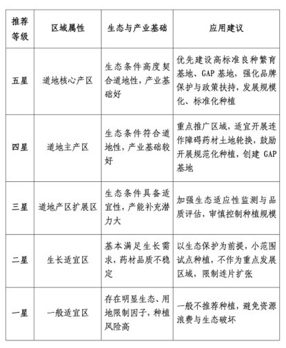 其中,“五星區(qū)域”推薦建設(shè)高標(biāo)準(zhǔn)良種繁育基地和 GAP(中藥材生產(chǎn)質(zhì)量管理規(guī)范)基地,強(qiáng)化政策扶持與品牌保護(hù)。倘若是“一星區(qū)域”,則意味著原則上不推薦種植該種藥材,以避免資源浪費(fèi)與生態(tài)風(fēng)險(xiǎn)。