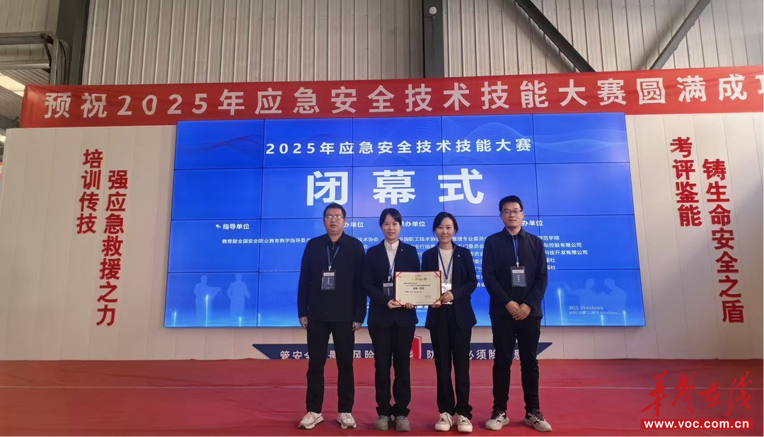 華聲在線11月25日訊(通訊員 趙玉容)11月23日,2025年全國應急安全技術技能大賽教師組決賽在河北秦皇島圓滿落幕。湖南有色金屬職業技術學院安全技術與管理專業范伊琳、文靜、張健、吳建四位教師組成的參賽團隊,在教務處副處長盧勇的帶領下,憑借其精心打造的《礦山救護》課程,從全國25支參賽隊伍中脫穎而出,以總分第一的優異成績,一舉奪得大賽一等獎第一名,充分展現了學院在應急安全人才培養領域的專業實力與教學水平。