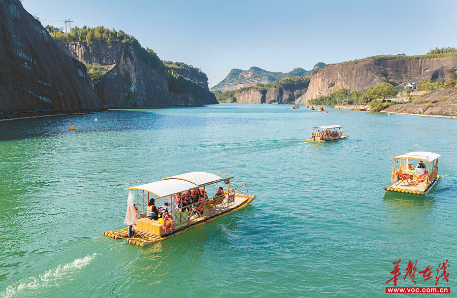 11月25日,陽光明媚,郴州市蘇仙區飛天山景區吸引眾多游客乘竹筏漫游翠江。近年來,該景區精心打造翠江泛舟鄉村旅游精品線路,讓游客仿佛置身于丹霞赤巖、碧水青山畫卷中。