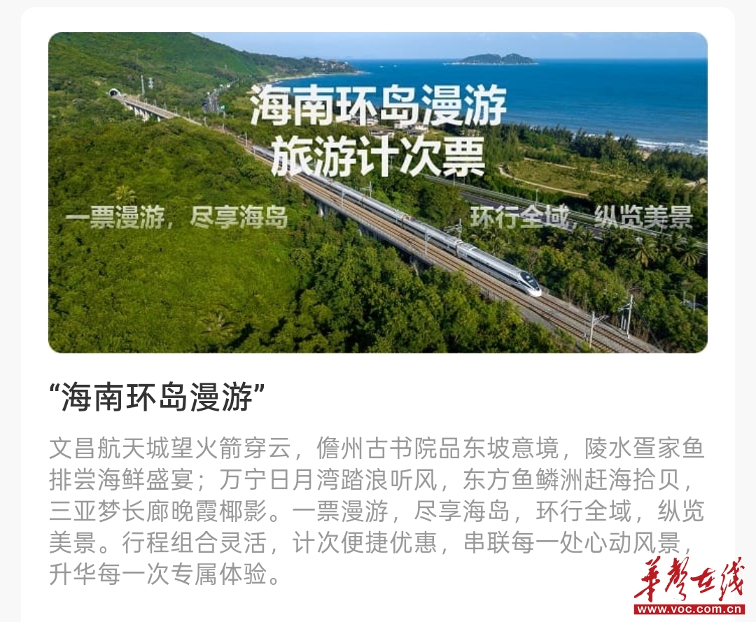 “海南環島漫游”計次票覆蓋環島高鐵沿線26個站點,包括海口、美蘭、文昌、瓊海等熱門旅游城市。國鐵廣州局海口車務段客運科工程師李春強表示,當前海南高鐵已串聯多個景點,隨著2025年底海南自貿港全島封關臨近,此次首次推出旅游計次票,將進一步激活島內旅游資源,方便旅客自由規劃行程、飽覽瓊島風光。