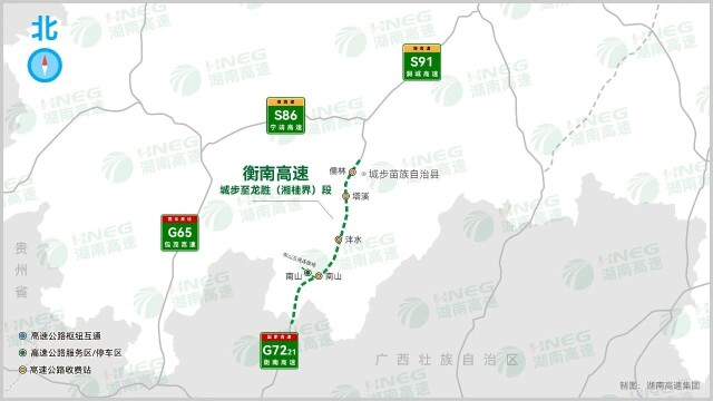 城龍高速起于城步儒林,順接已建的武岡至靖州高速公路城步支線,經塔溪鄉、泮水、粗水,止于湘桂兩省區交界處的五團鎮雙田,順接擬建的城步至龍勝高速公路廣西段,全長51.79公里,設計時速100公里,采用四車道高速公路標準建設,設儒林、塔溪、泮水、南山等4處互通式立交。