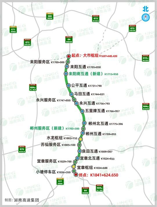 G4京港澳高速耒陽大市至宜章(湘粵界)段改擴建工程起于耒陽大市樞紐,往南經耒陽、永興、蘇仙、北湖和宜章等5個縣市區,止于宜章小塘(湘粵省界),與G4京港澳高速粵北段相接,全長144.309公里,采用雙向八車道高速公路標準對老路進行改擴建。全線設互通立交12處、收費站11座、服務區5處、停車區1處,其中新增郴州服務區、耒陽南互通。