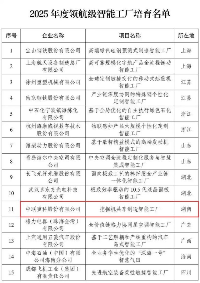 華聲在線11月27日訊(全媒體記者 謝卓芳 見習記者 符碩)11月27日舉行的2025世界智能制造大會上,工業和信息化部等六部門公布我國首批領航級智能工廠名單,全國共有15家企業入選。中聯重科憑借“中聯重科挖掘機共享制造智能工廠”項目成功入選,成為湖南唯一一家上榜企業。
