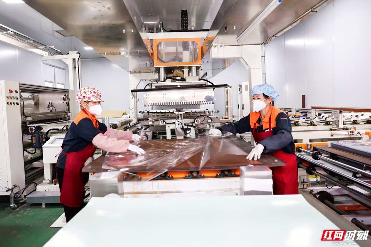 在湖南茶陵經開區一間明亮的生產車間里,兩位全副武裝的工人正協同作業。她們身著橙黑相間的工作服,外系紅色圍裙,小心翼翼地搬運著一塊被透明離型膜保護的大型板材。