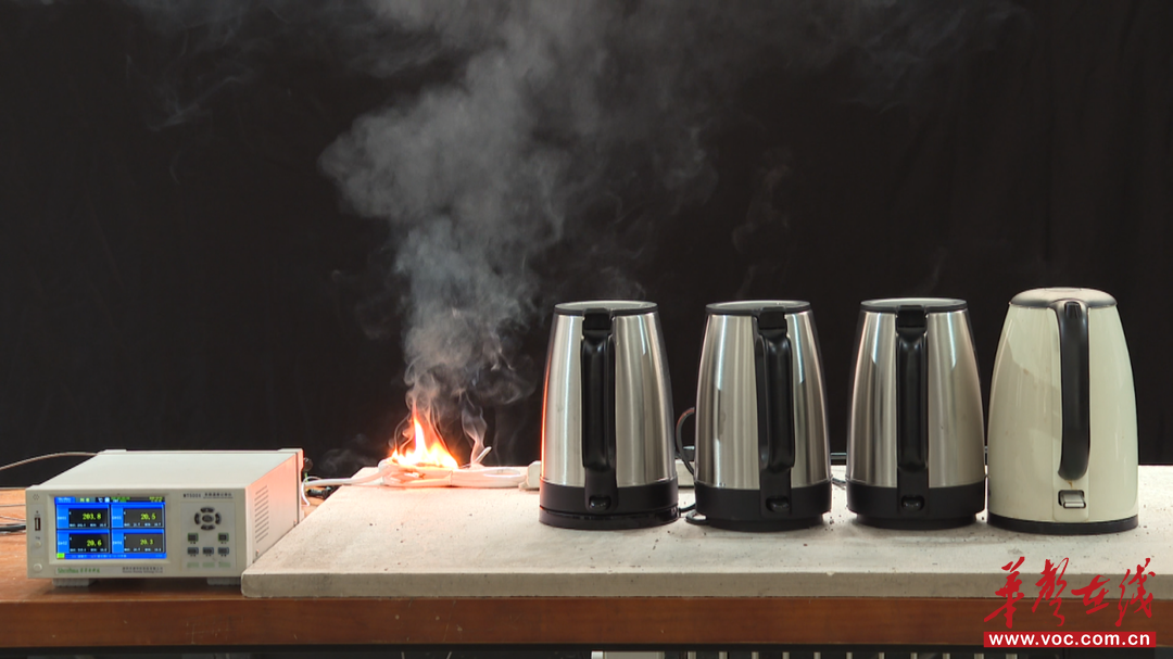 試驗(yàn)中,消防員將4個(gè)功率均為1800瓦的燒水壺,同時(shí)連接在一個(gè)額定功率為2500瓦的插線板上,并模擬常見隱患——將插線板的電線捆扎在一起。當(dāng)4個(gè)水壺同時(shí)啟動(dòng),測(cè)溫儀數(shù)據(jù)顯示,電線溫度在短短兩分鐘內(nèi)就從初始的21攝氏度飆升至100攝氏度,插線板電線隨即冒出縷縷青煙。