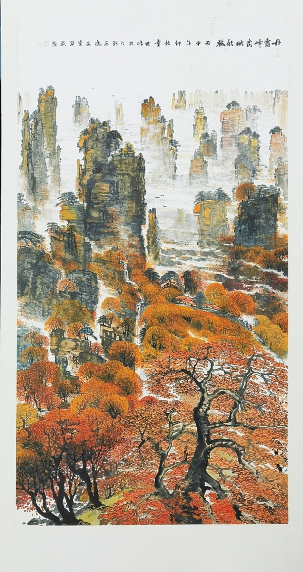 其色彩運用更具革命性。雖以水墨為基底,但大膽融入湘西地貌特有的地質色譜:以赭石、朱砂點染秋林,以石青罩染山體陰面,以金黃潑寫層林,皆源自武陵丹霞地貌與季相變幻的視覺經驗。這種“以色助墨光”的手法,既突破“水墨為上”的教條,又以寫生為基礎避免艷俗,形成“武陵虹霓”般的色彩美學。